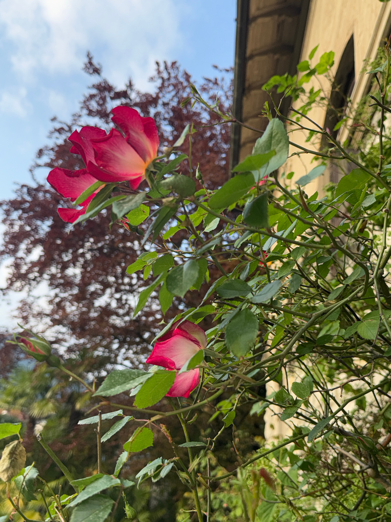 The image depicts a cluster of rose branches with blooming and budding flowers, seen against a background of blurred foliage and a section of a building facade and blue sky. The roses are red with a l…read more