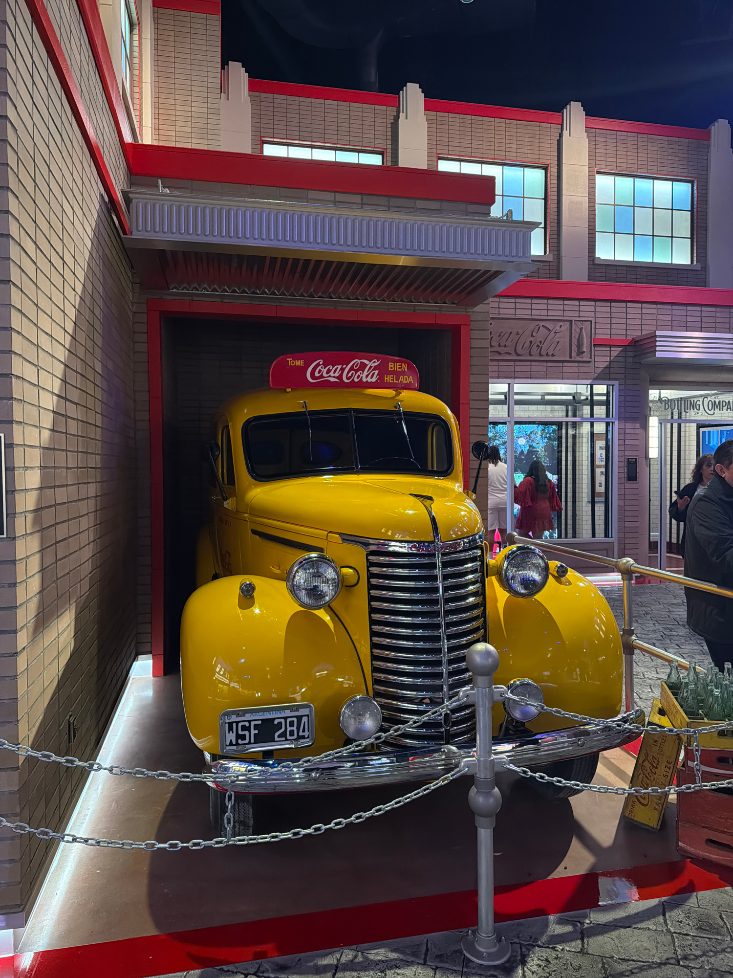 The image depicts a vintage yellow Coca-Cola delivery truck, part of an exhibition at the World of Coca-Cola museum in Atlanta, Georgia, USA. The truck is positioned within a staged scene resembling a…read more
