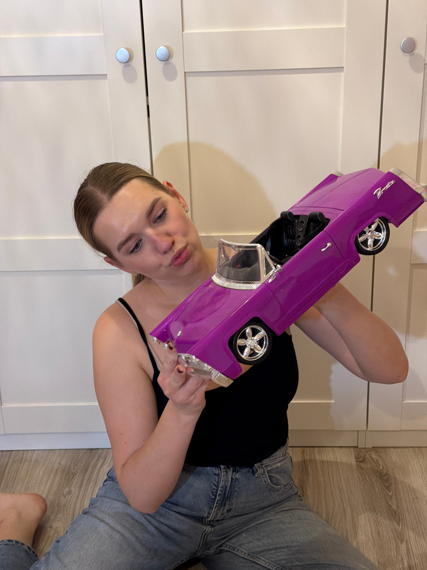 A young woman is holding a purple toy car indoors. She is wearing a black top and jeans. She is sitting with her legs crossed. The background shows a white cabinet and a wooden floor. It is not possib…read more