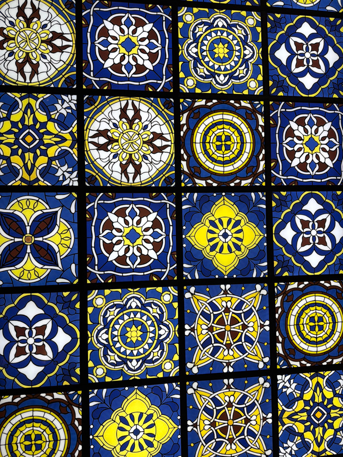 The image displays a grid of square tiles, each adorned with a unique floral or geometric pattern. The primary colors are blue, yellow, brown, and white, set against a dark grid. The patterns are symm…read more