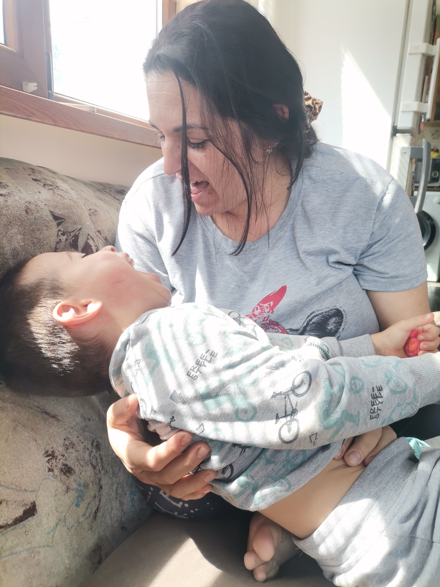 A middle-aged woman with dark hair and a gray t-shirt is holding a young child in her lap. The child, who is wearing a patterned gray sweatshirt and pants, is turned toward the woman, looking up at he…read more