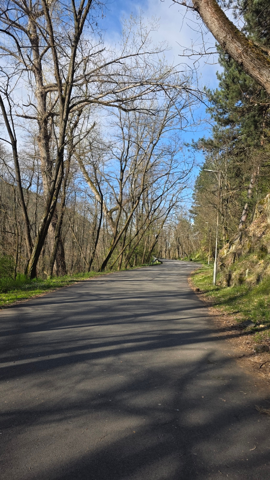 The image depicts a road in Blagoevgrad, Bulgaria. The road is asphalt, running straight, with shadows from trees. On either side of the road are trees, some bare, others with green foliage. Above the…read more