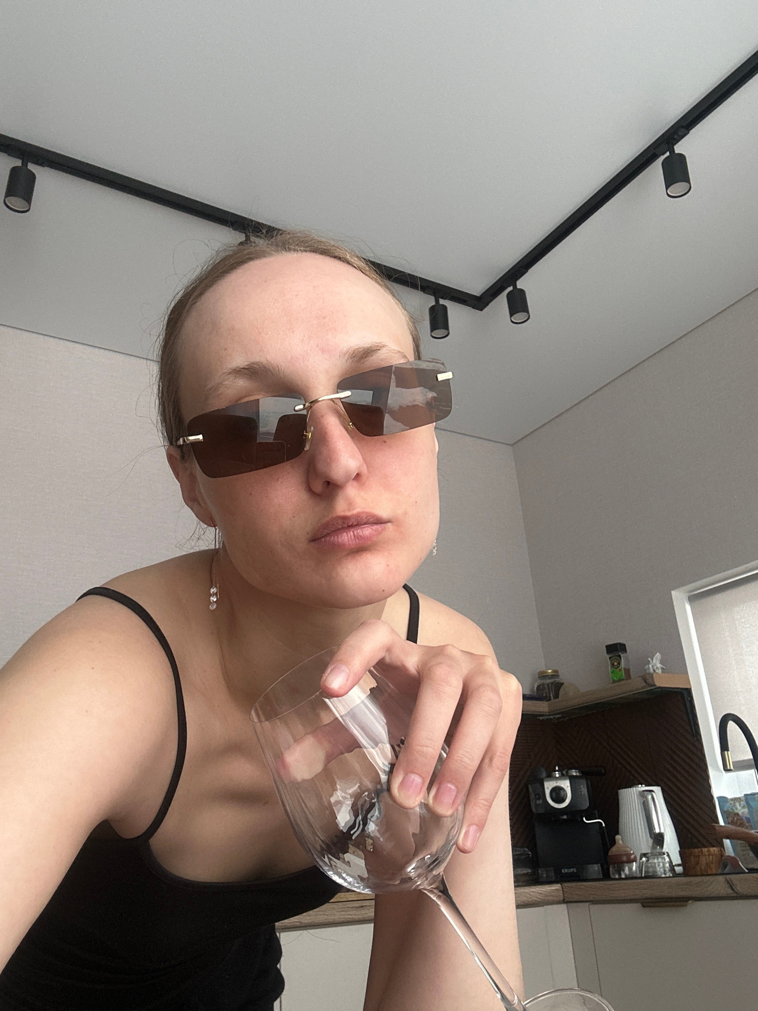 A person wearing brown sunglasses and a black top is holding a large wine glass. The location appears to be an indoor setting, possibly a residential space in Sepych, Russia, given the contextual info…read more
