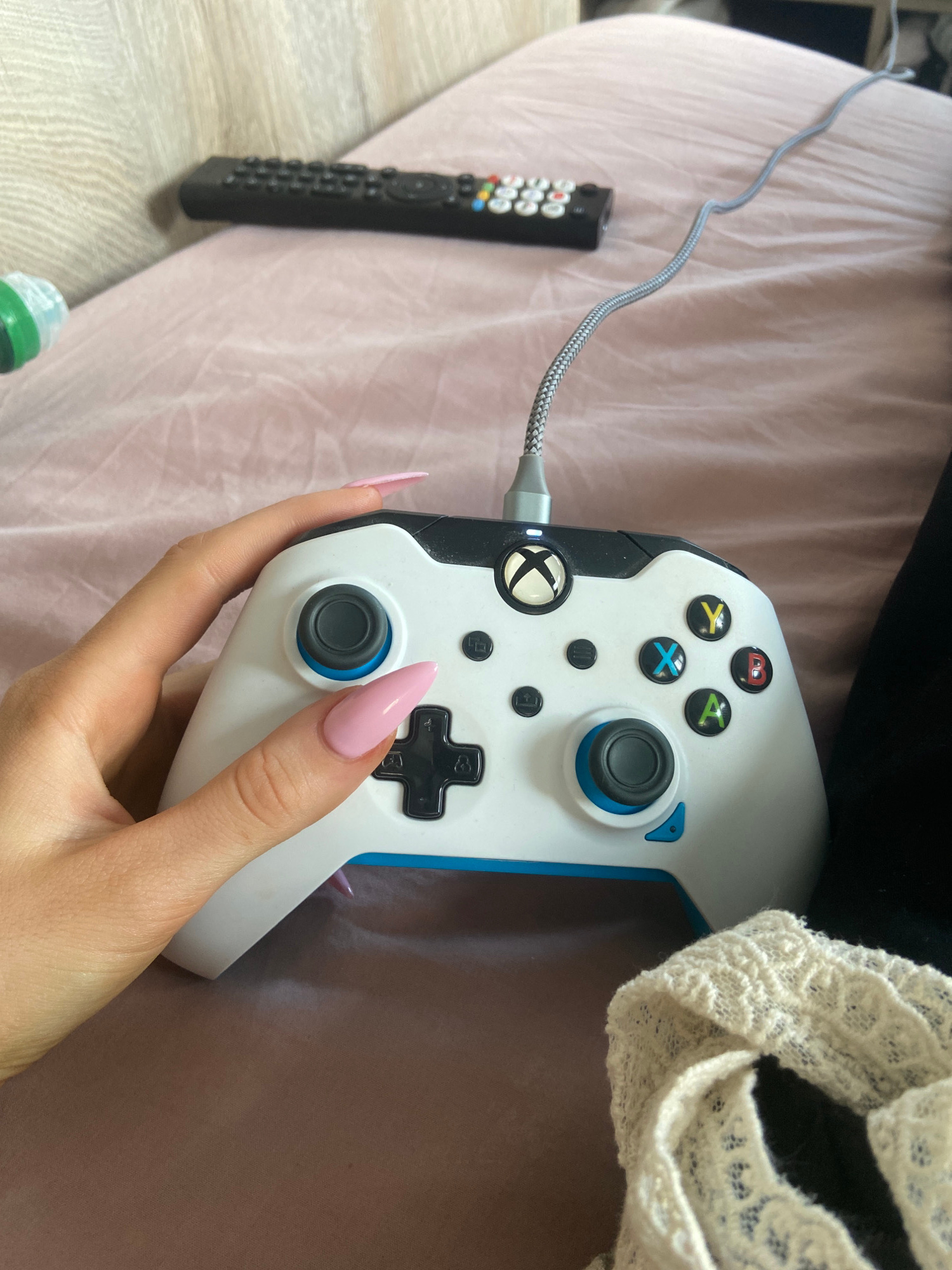 The image shows a person holding an Xbox controller. The controller is white with blue accents and is connected to a cable. A television remote lies next to it on a pink sheet. The scene is indoors. N…read more