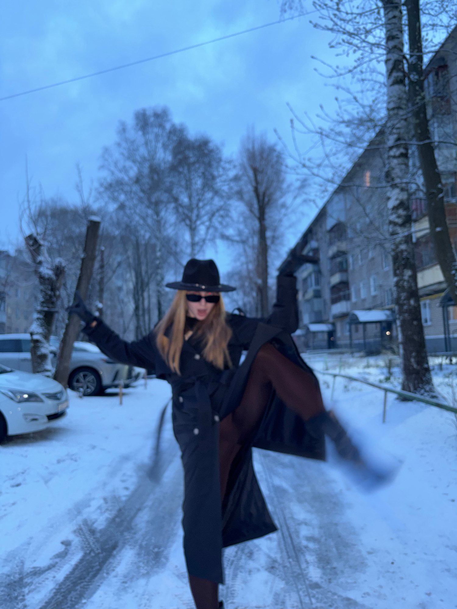A long-haired person is captured mid-action, striking a dynamic pose on a snow-covered street in Perm, Russia. The individual, likely female, wears a black wide-brimmed hat, dark sunglasses, a long bl…read more