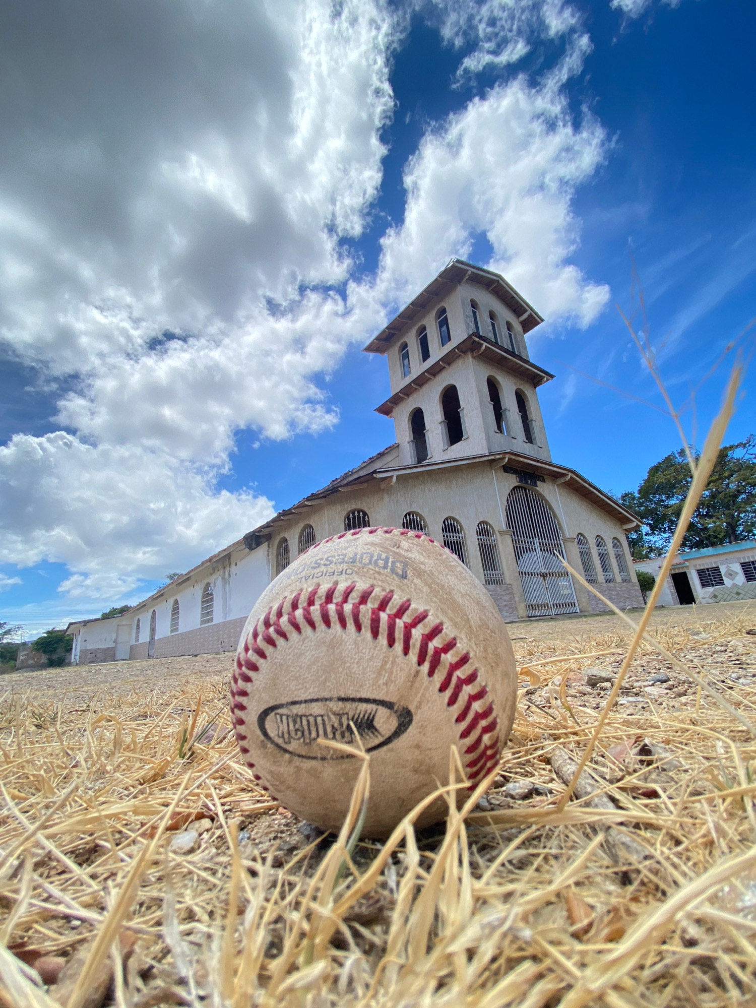 A low-angle, wide shot features a baseball lying in dry grass in front of the Iglesia del Cristo del Buen Viaje in Juan Griego, Venezuela. The baseball is positioned in the lower left of the frame, it…read more