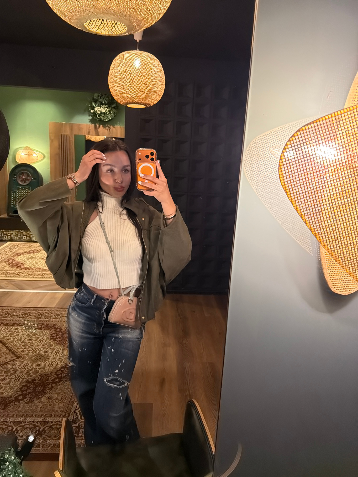 A woman is taking a selfie in a mirror. She is wearing a white turtleneck, an olive green jacket, and ripped blue jeans. She is holding an orange iPhone. The background includes woven light fixtures,…read more
