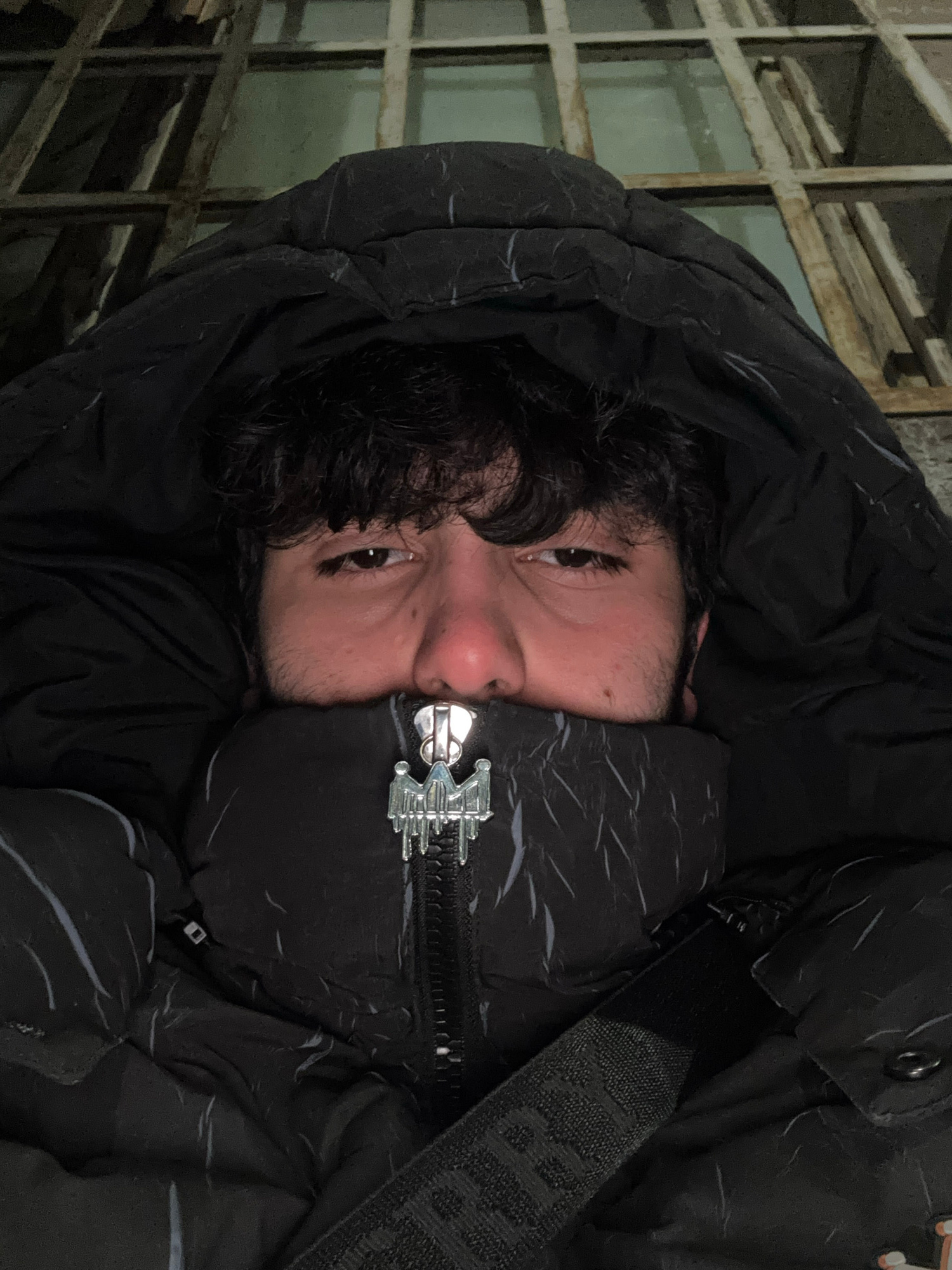 A person with dark hair and light skin peers from the confines of a black hooded jacket, zipped up to the nose with a decorative metallic zipper. The person is positioned against a weathered, gray-col…read more