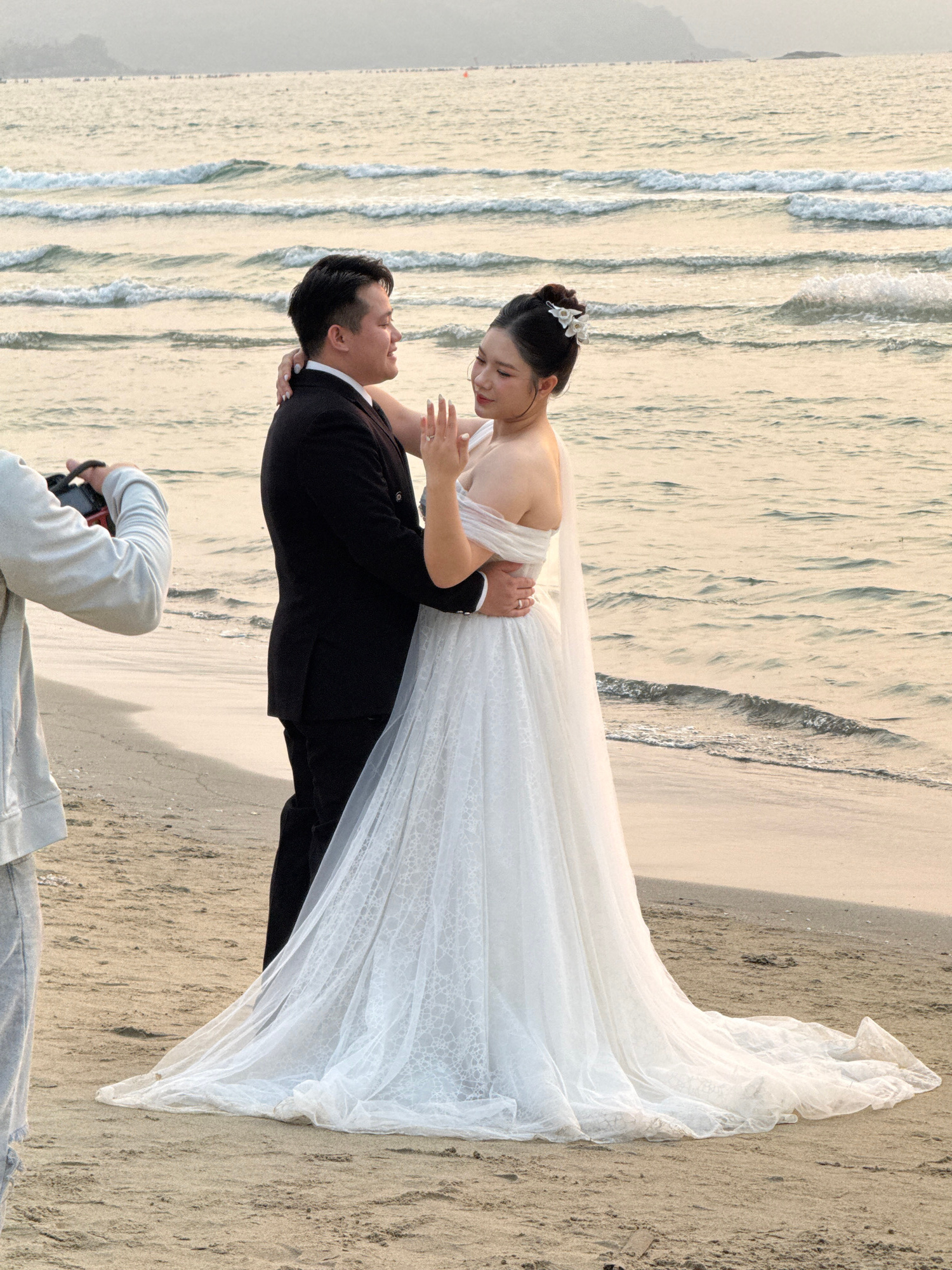 A wedding photoshoot is in progress on a sandy beach with the ocean waves visible in the background. A bride wearing a white wedding dress and a groom in a black suit are the focal point of the scene.…read more