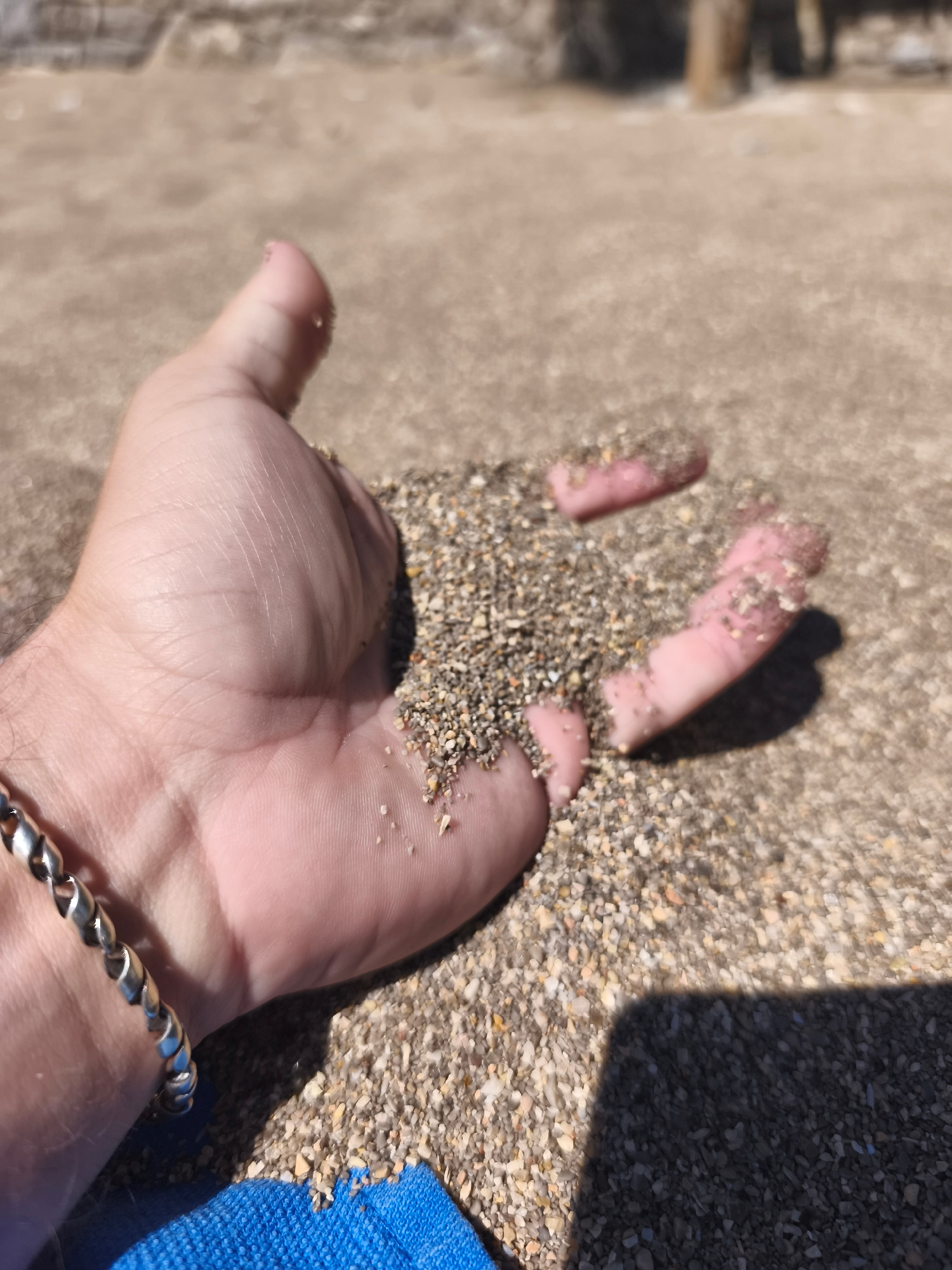 The image shows a person's hand filled with sand. The hand is holding the sand against a backdrop of more sand. The person is wearing a silver bracelet. A small piece of blue fabric is visible at the…read more