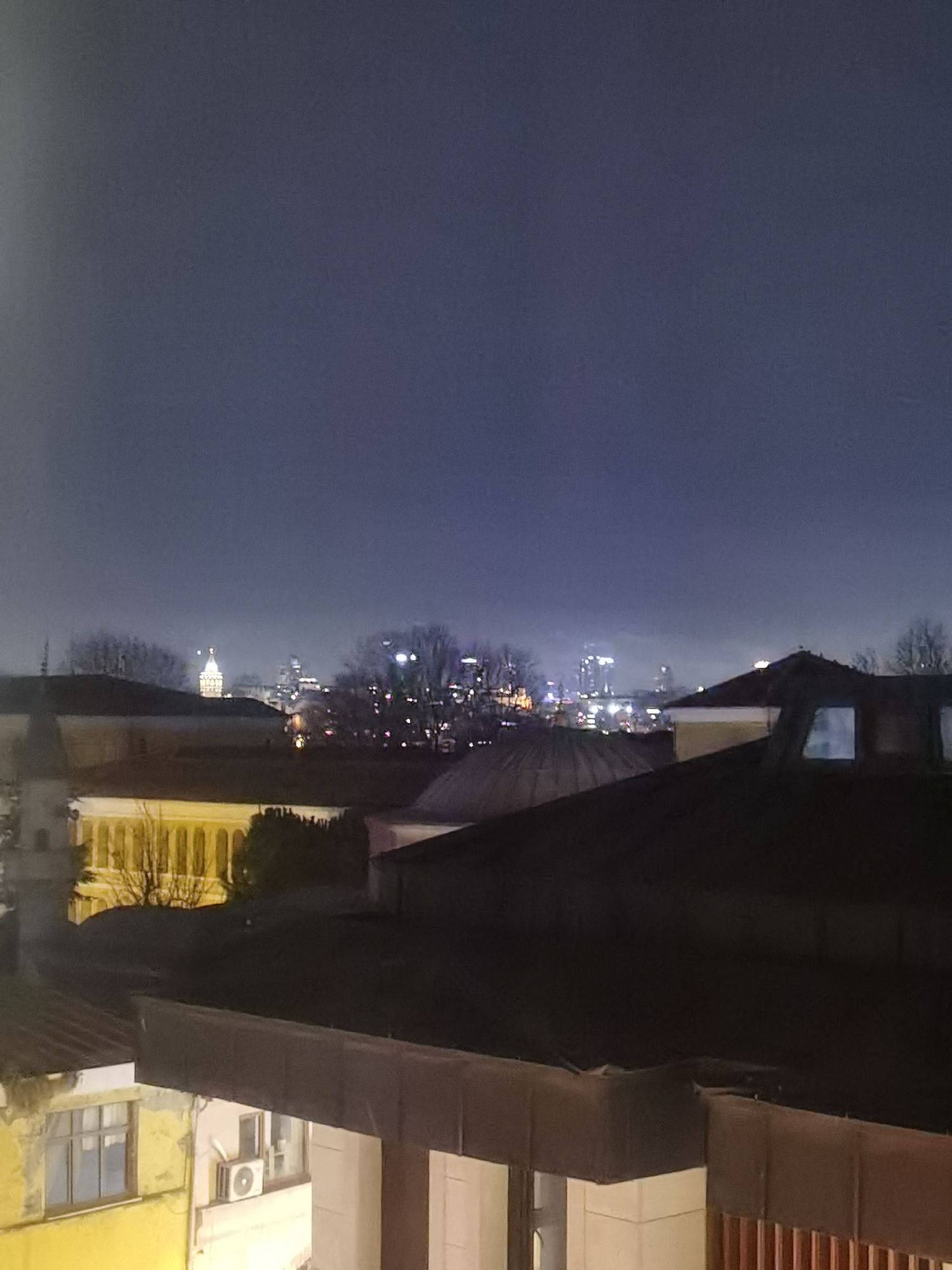 A low-angle, nighttime view of Istanbul, Turkey is depicted. The foreground comprises rooftops and the upper stories of buildings, illuminated by artificial light. The architecture appears to be a mix…read more