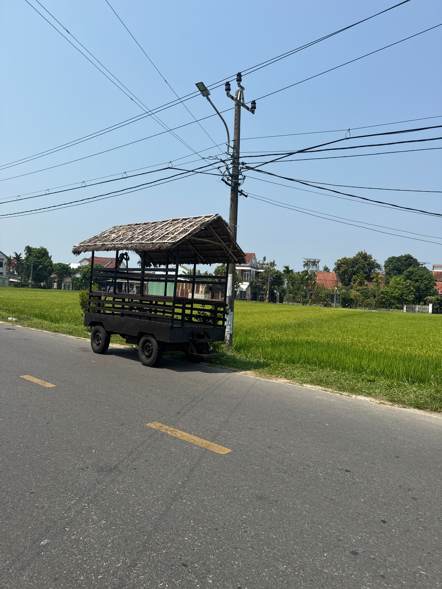 The image shows a utility cart with a thatched roof parked on the side of a paved road. A wooden utility pole with power lines runs along the road. Next to the road is a field of green grass. A few ho…read more