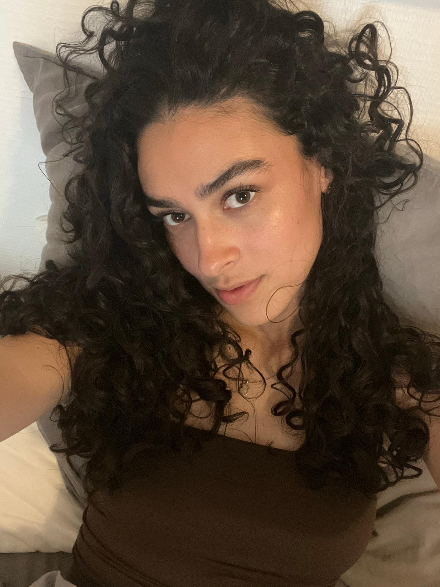 A young woman with dark, curly hair is lying on a pillow, possibly in bed. She is wearing a brown top. Her eyes are open, and she is looking at the camera. A necklace is visible on her neck. The backg…read more