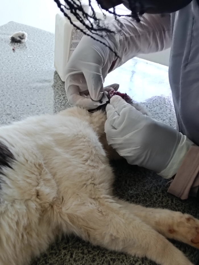 This indoor scene, located in a clinical facility in Nairobi, Kenya, depicts a detailed medical procedure. A person, whose hands are covered in white medical gloves, is actively engaged in work on the…read more