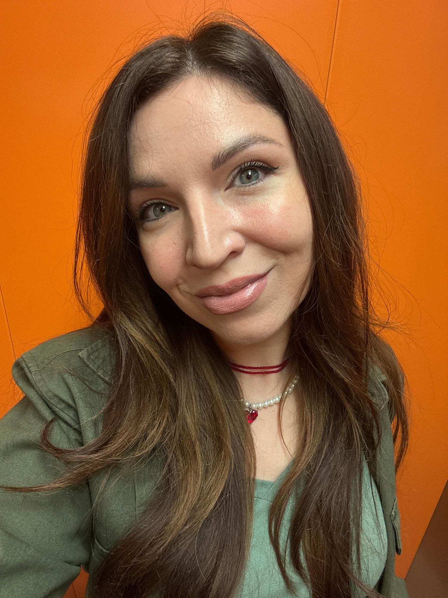 A young woman with long brown hair is seen in a close-up portrait. She has fair skin, gray eyes, and is wearing lipstick. She is wearing a light green collared shirt and a pearl necklace with a red st…read more