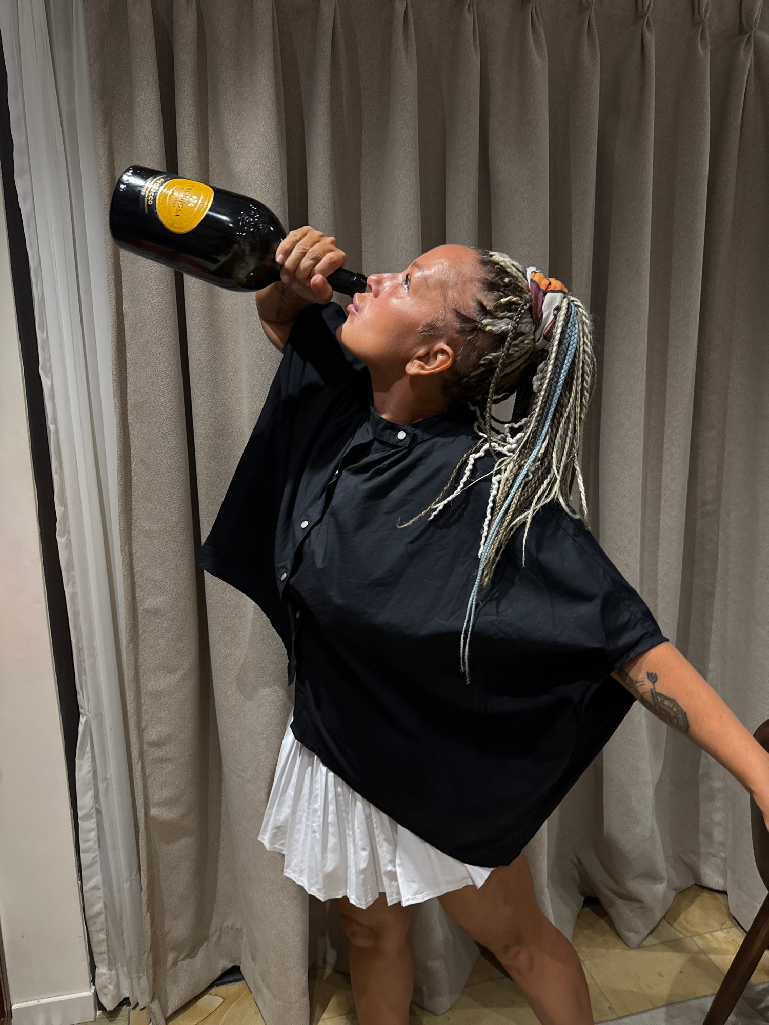 A woman with braided hair is sitting on stairs and drinking directly from a bottle of La Gioiosa Prosecco wine. She is wearing a black shirt over a white dress. The location is not specified in the im…read more