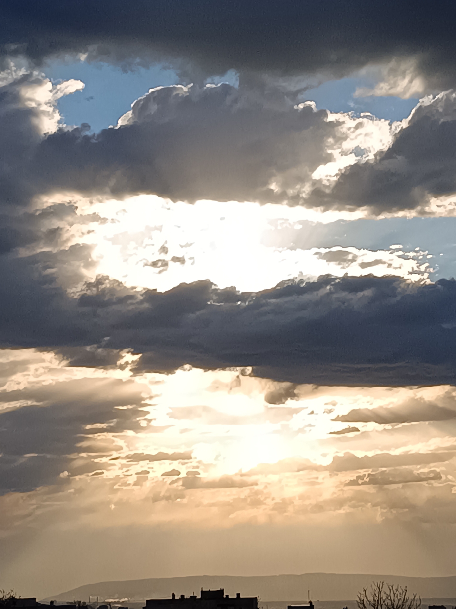 The image depicts a cloudy sky with a bright sun shining through openings in the clouds. The clouds range from dark grey to light grey and white. Patches of blue sky are visible in the upper portion o…read more