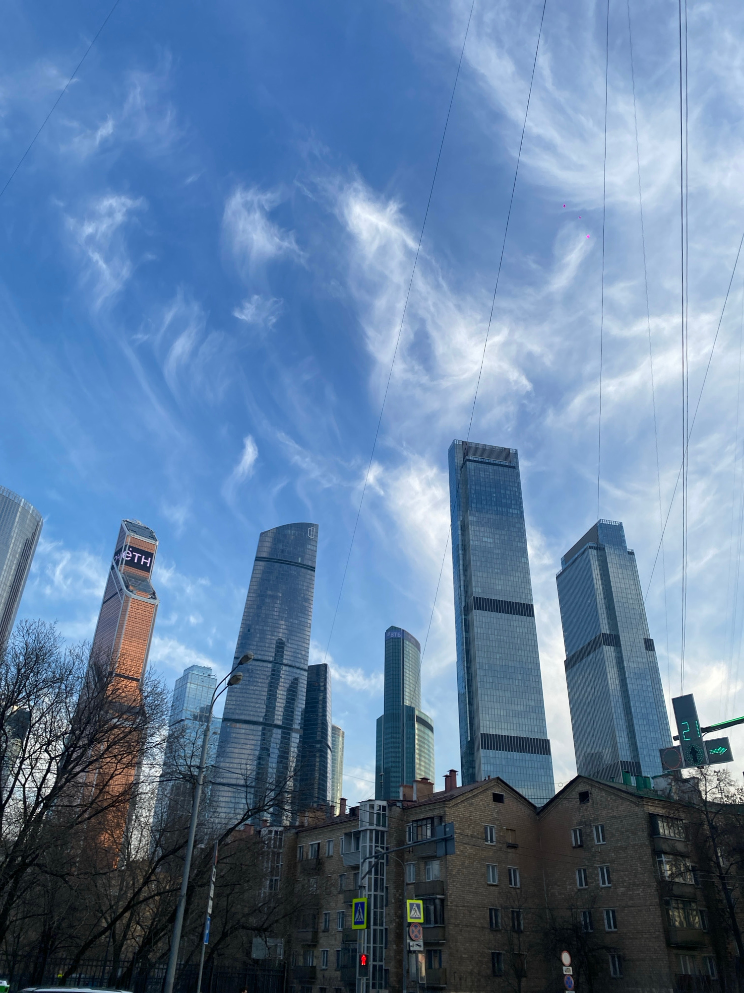 The image depicts an urban landscape under a bright blue sky with wispy white cirrus clouds, crisscrossed by multiple dark overhead wires. Two faint, small magenta blurs are visible high in the sky.…read more
