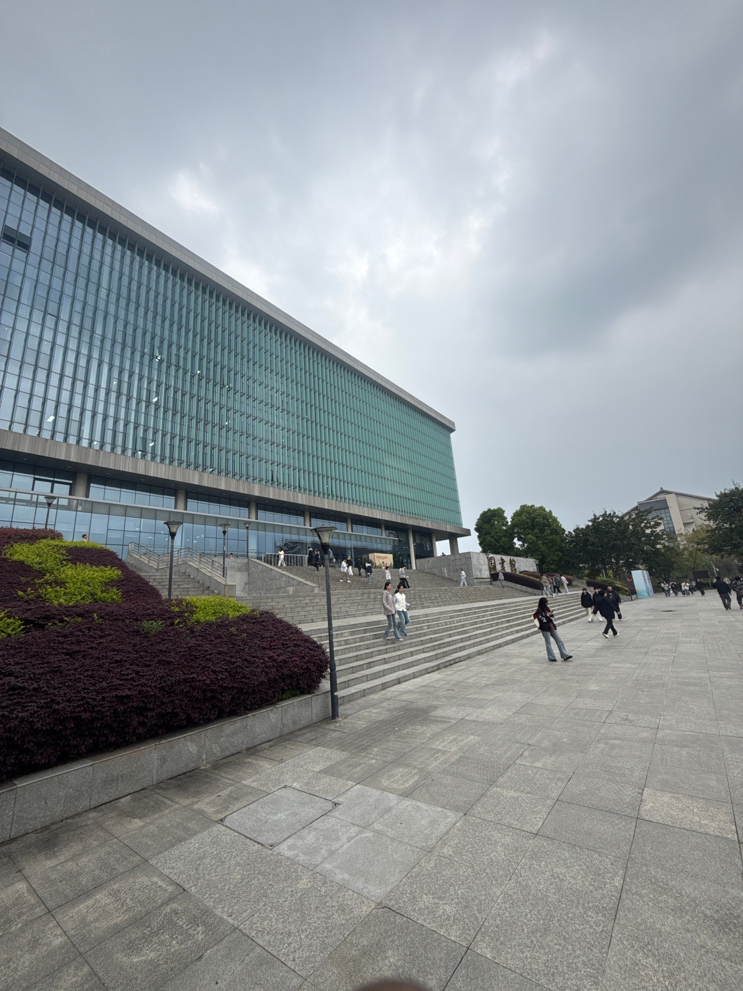This image depicts a modern building with a glass facade located in Jiangjin, China. The building is a tall rectangular structure, possibly an office building or university building, with a linear pattern of windows. In front of the building, there is a paved area with large gray tiles and steps leading up to the entrance. People are walking on these tiles. In the foreground, there is a long rectangular planter filled with bushes with maroon-colored leaves and some green foliage. The sky is overcast and gray. | Open Wire