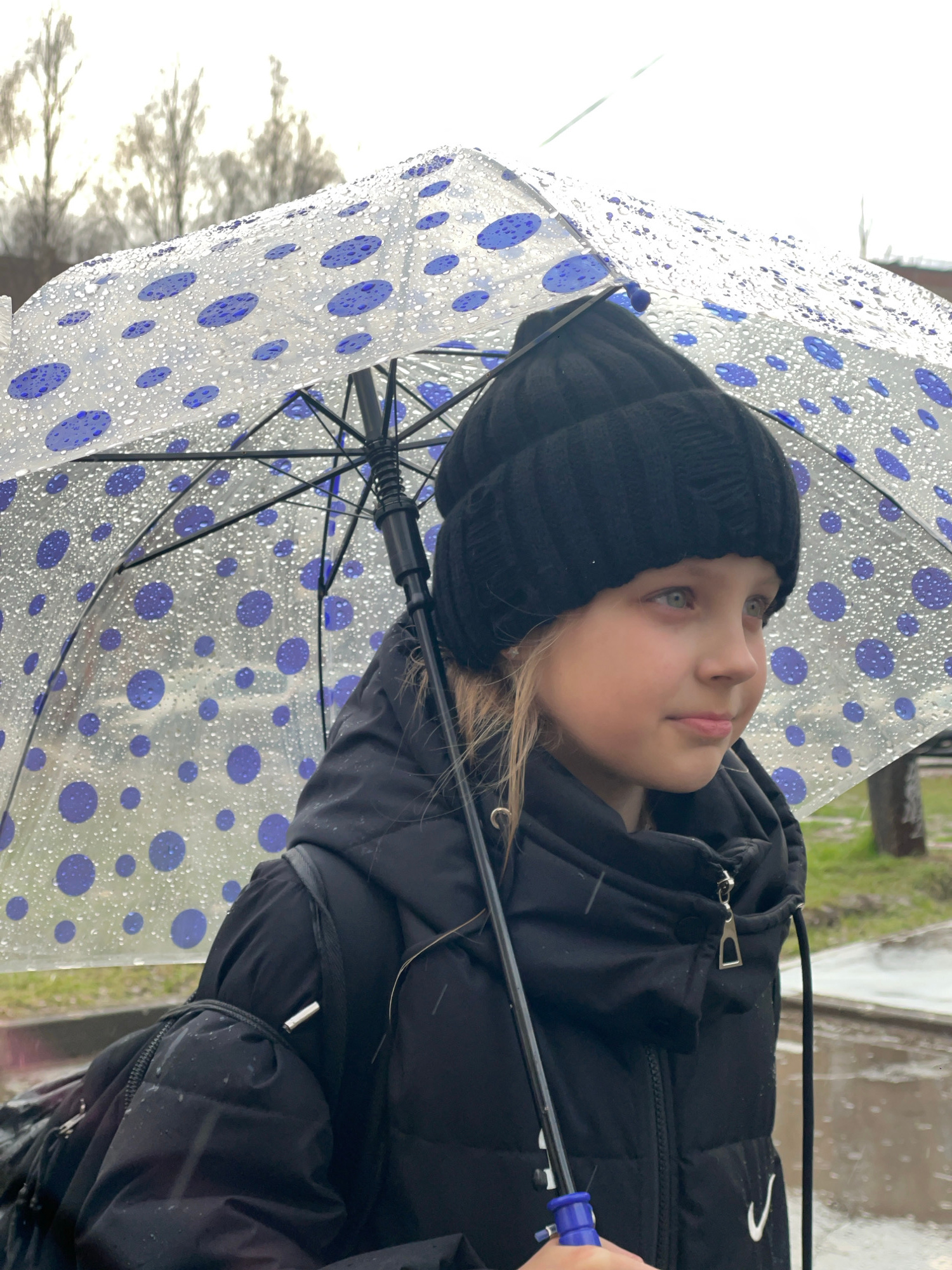 A girl stands outside holding a transparent umbrella with blue polka dots. She wears a black knit hat and a black puffer jacket. The background is blurred, suggesting an outdoor location. Specific det…read more