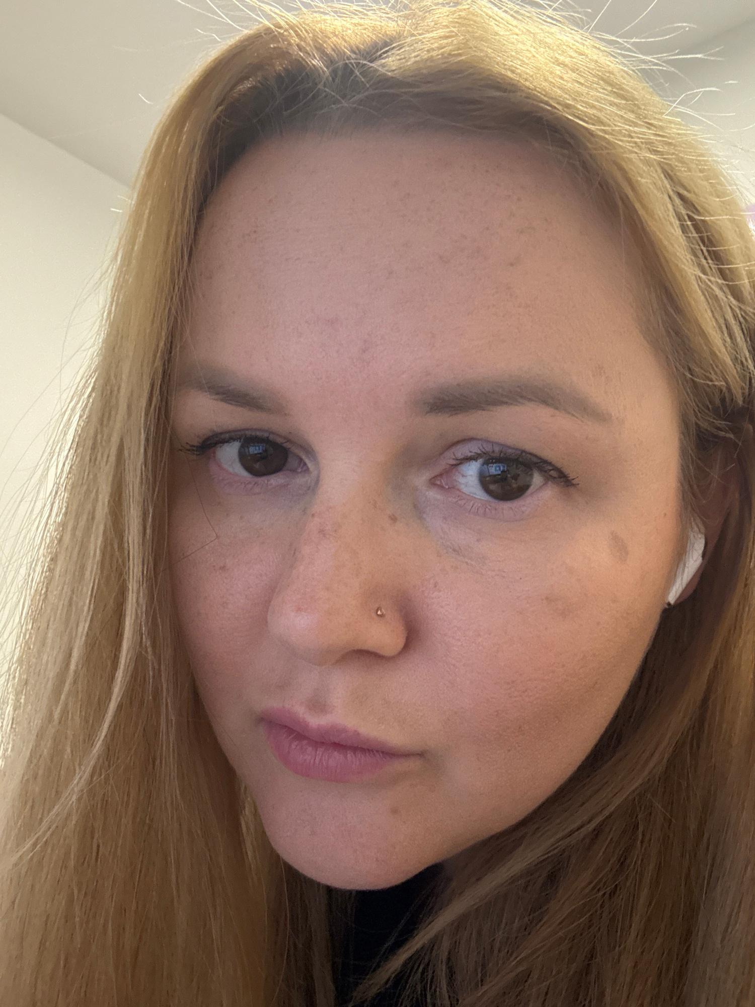A close-up, rotated image of a fair-skinned individual with blonde hair. The person has brown eyes, freckles, and a nose piercing. There is a white earbud visible in the right ear. The background appe…read more