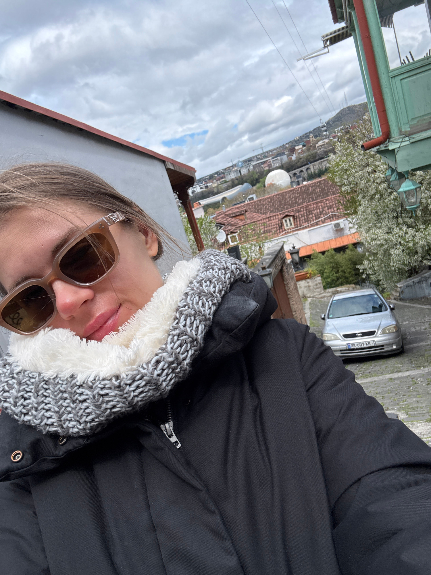 A low-angle medium shot photograph, rotated 90 degrees clockwise, depicts a woman from the chest up, wearing sunglasses and a black winter coat with a gray and white knit hood trimmed with white faux…read more