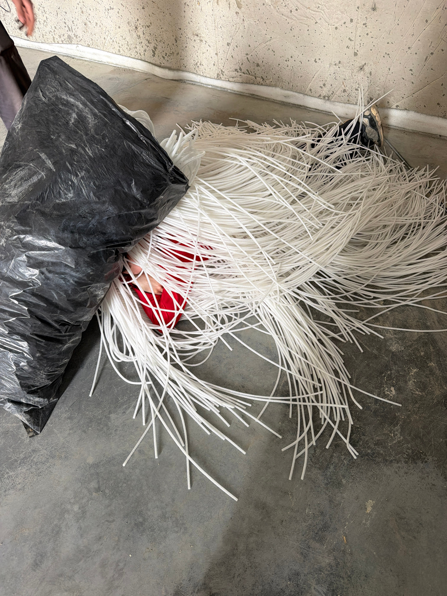 The image presents an overhead view of an indoor industrial or workshop setting. The central focus is a large, sprawling pile of numerous white, flexible, tube-like strands or cords, possibly made of…read more