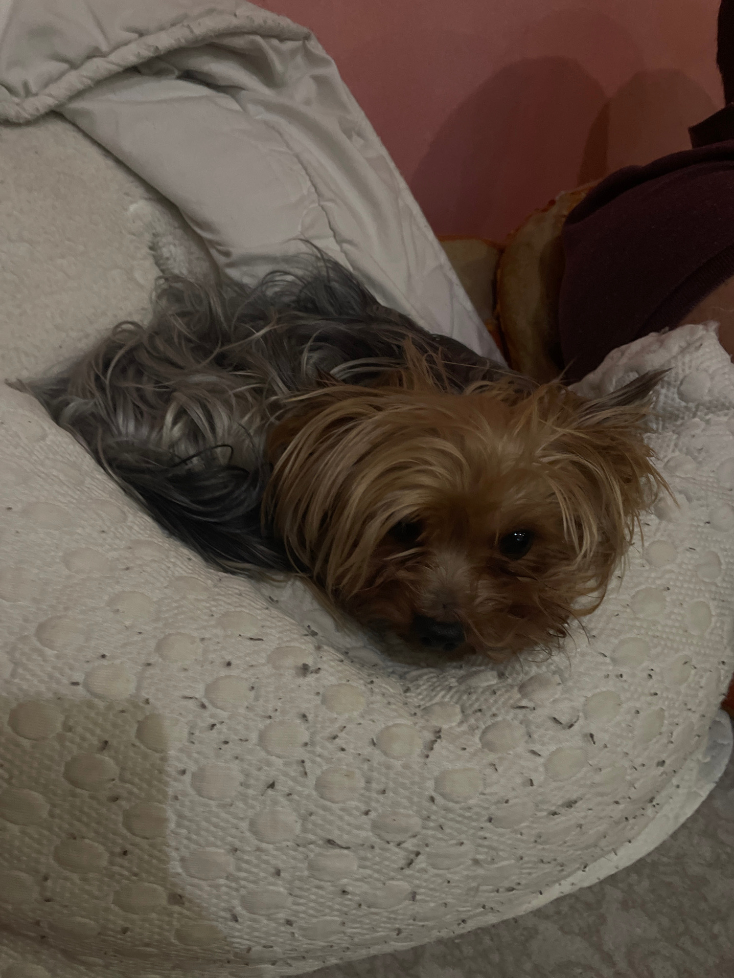 A small dog, possibly a Yorkshire Terrier, is resting on a white textured blanket. The dog has a mix of brown and gray fur. Part of a shoe or slipper is visible in the upper left corner, along with a…read more