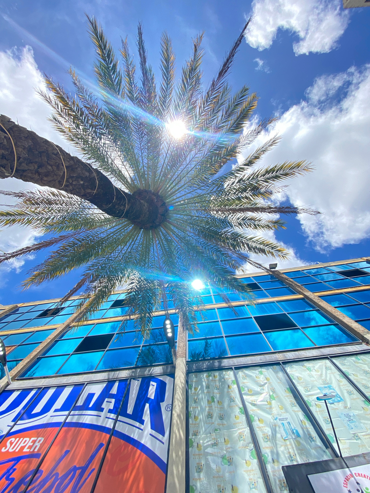 The image, taken from a low angle, shows a palm tree with its fronds spread out against a bright blue sky with scattered white clouds. The sun is shining through the fronds, creating a lens flare effe…read more