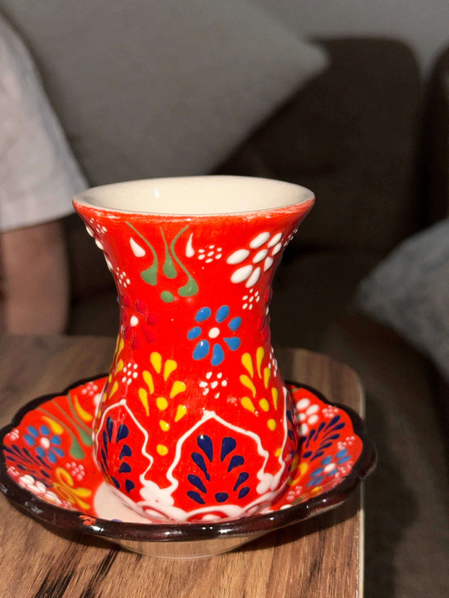 An eye-level, close-up shot focuses on a colorful ceramic vase, likely of Turkish origin, resting on a light brown wooden surface. The vase is predominantly red with a variety of floral patterns in blβ¦read more