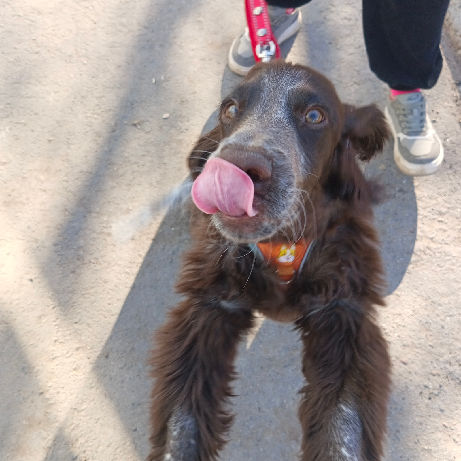 The image features a close-up, high-angle view of a playful brown dog looking directly up at the camera. The dog has dark brown, medium-length fur with lighter white or grey markings on its muzzle, ch…read more