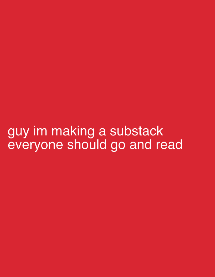 The image displays white sans-serif text centered horizontally on a solid red background. The text reads: "guy im making a substack everyone should go and read". No individuals, objects, or environmen…read more
