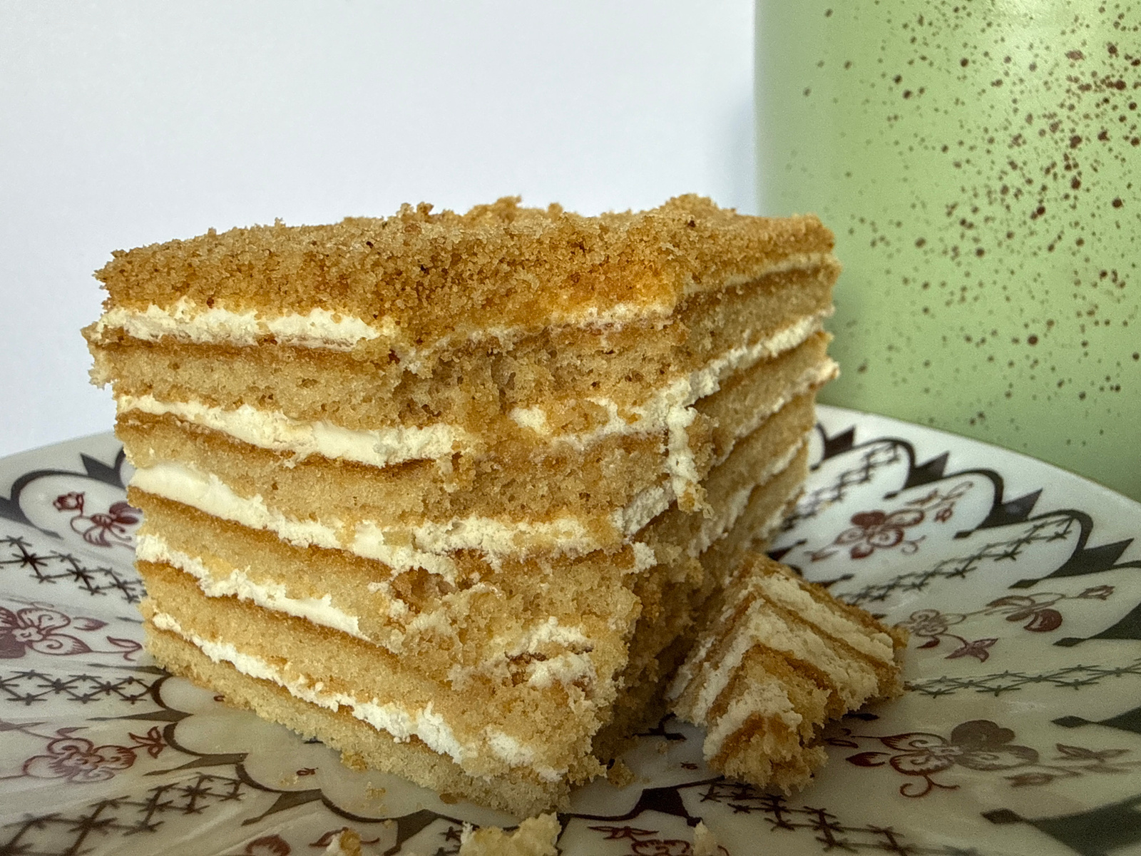 A triangular slice of multi-layered cake rests on a decorative plate with floral designs. The cake appears to have five layers of cake alternating with four layers of white cream. A crumbly topping co…read more