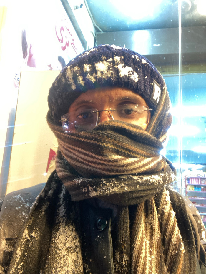 The image displays a person dressed in heavy winter clothing, oriented such that their face is seen from the side, looking slightly upwards. They are wearing a dark blue knit beanie or hat, adorned wi…read more