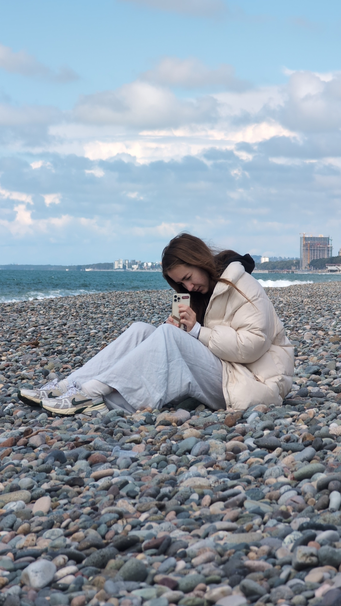 A rotated long shot shows a young woman using a smartphone on a pebble beach on the coast of Kobuleti, Georgia. The woman is seated cross-legged on the pebble-strewn beach. She is wearing a light-colo…read more