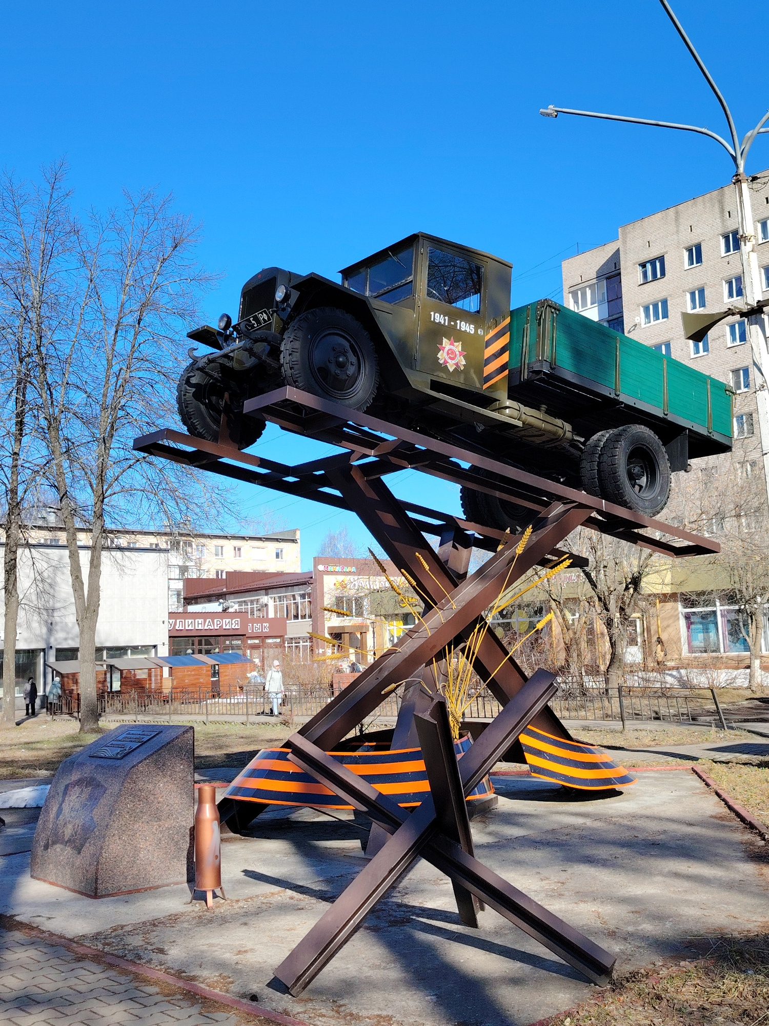 The image shows a military vehicle mounted on a metal structure in the city of Chaikovsky, Russia. The vehicle, identified as a GAZ-AA truck, is painted in military green and features markings that in…read more