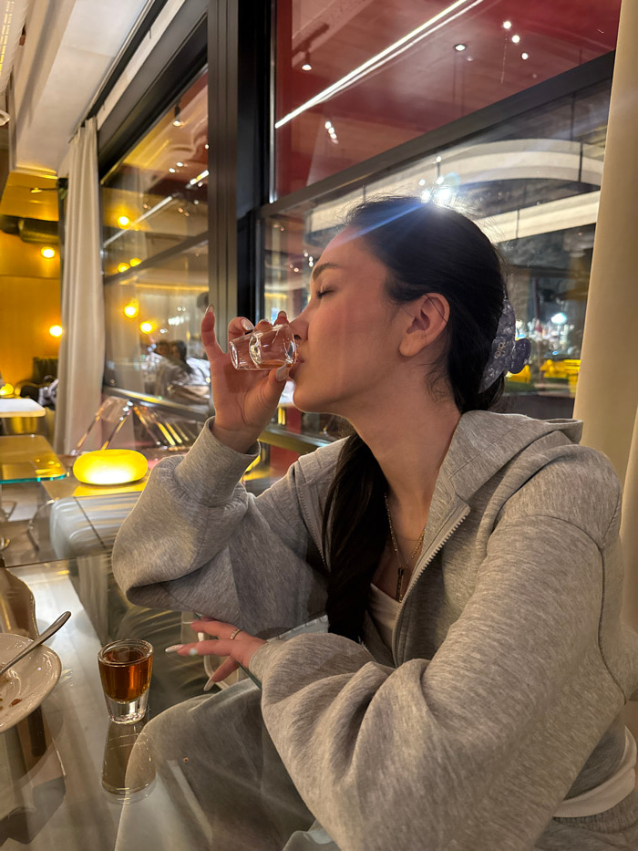 A female individual is depicted indoors at Sherep Restaurant on Amiryan Street in Yerevan, Armenia. She is seen drinking from a small, clear, square-based glass containing an amber-colored liquid, wit…read more