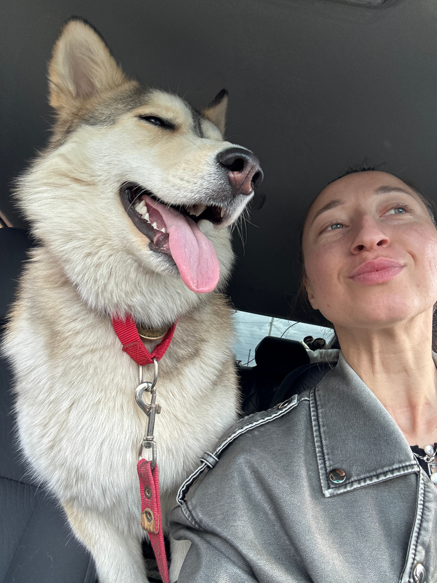 A woman and a dog are in a car. The woman has fair skin and light green eyes and is wearing a light gray leather jacket. The dog is a Siberian Husky with white fur and a red collar. The dog's mouth is…read more