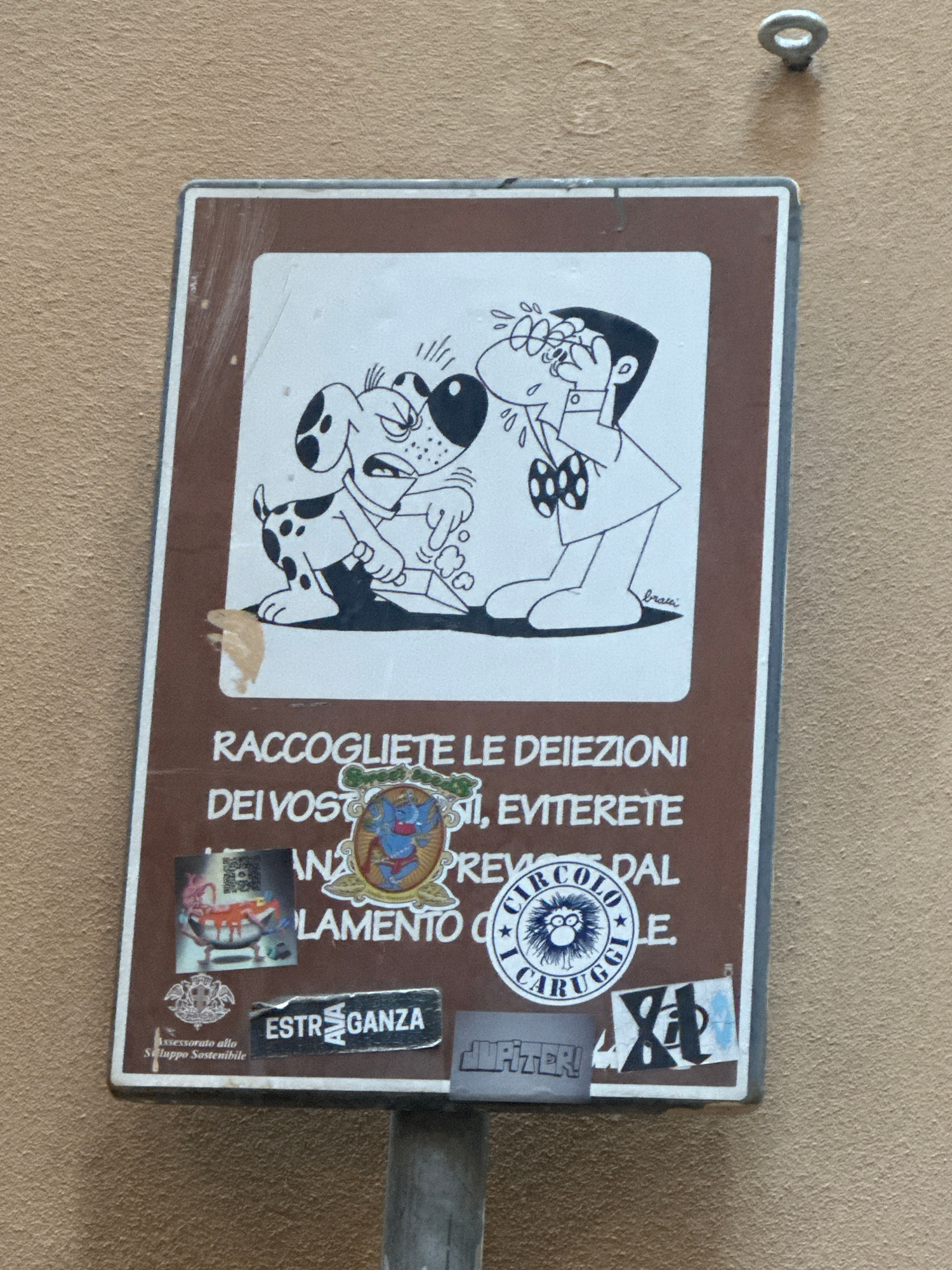 The image shows a brown and white sign attached to a pole in Genoa, Italy. The sign has a cartoon of a person and a Dalmatian dog scooping up feces. Text on the sign reads "RACCOGLIETE LE DEIEZIONI DE…read more