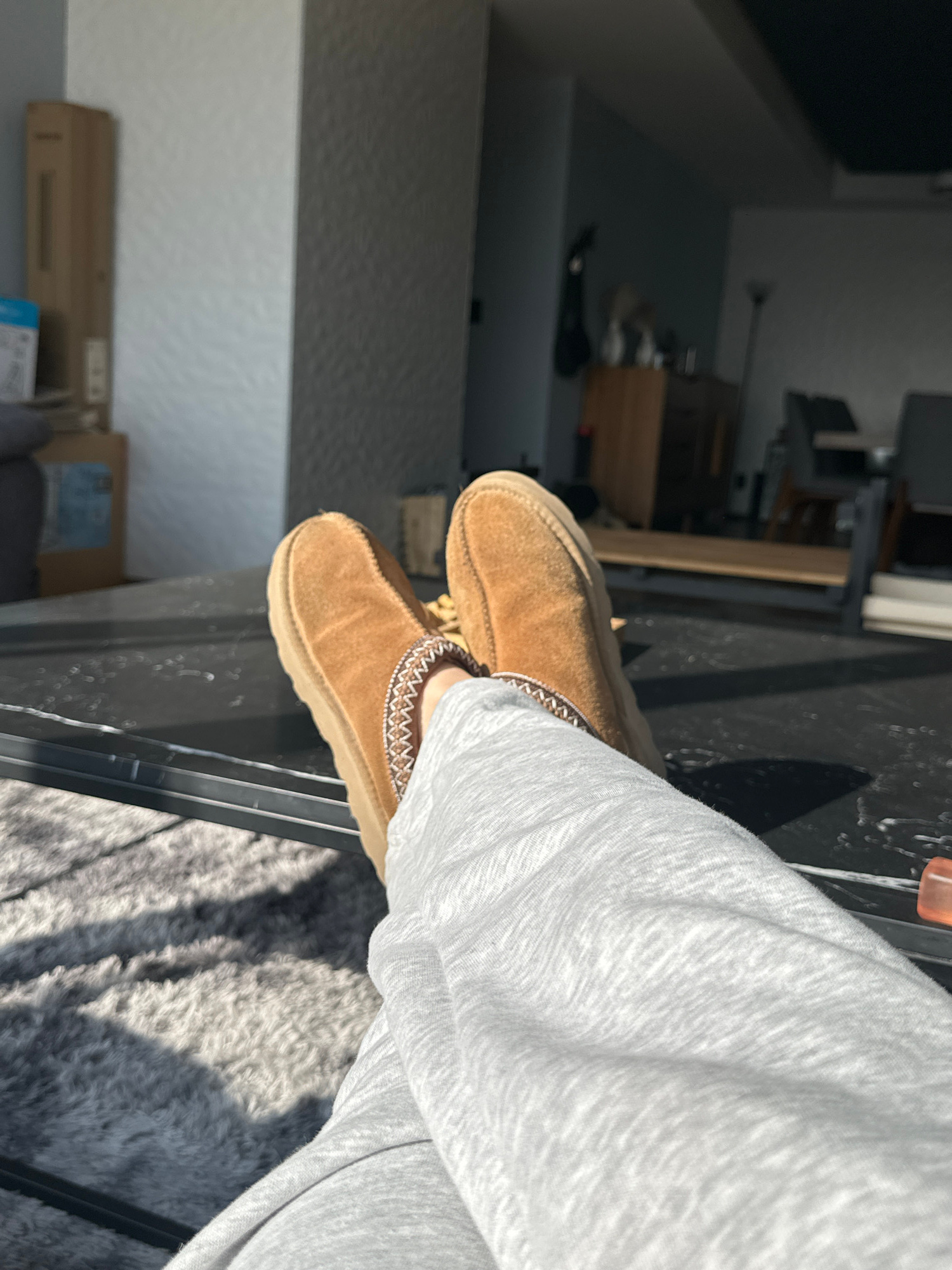 A close-up, slightly rotated, shot captures a person wearing light gray sweatpants and brown suede slippers with a decorative trim around the opening. They are positioned on a black surface, likely a table, with a gray, shaggy rug visible in the background. The environment includes a glimpse of a room with walls, and a structure that seems to be furniture, possibly a desk or storage unit. The location appears to be indoors, with natural light streaming in. There is no explicit evidence in the image to confirm the specific location as Huixquilucan de Degollado, Mexico. | Open Wire