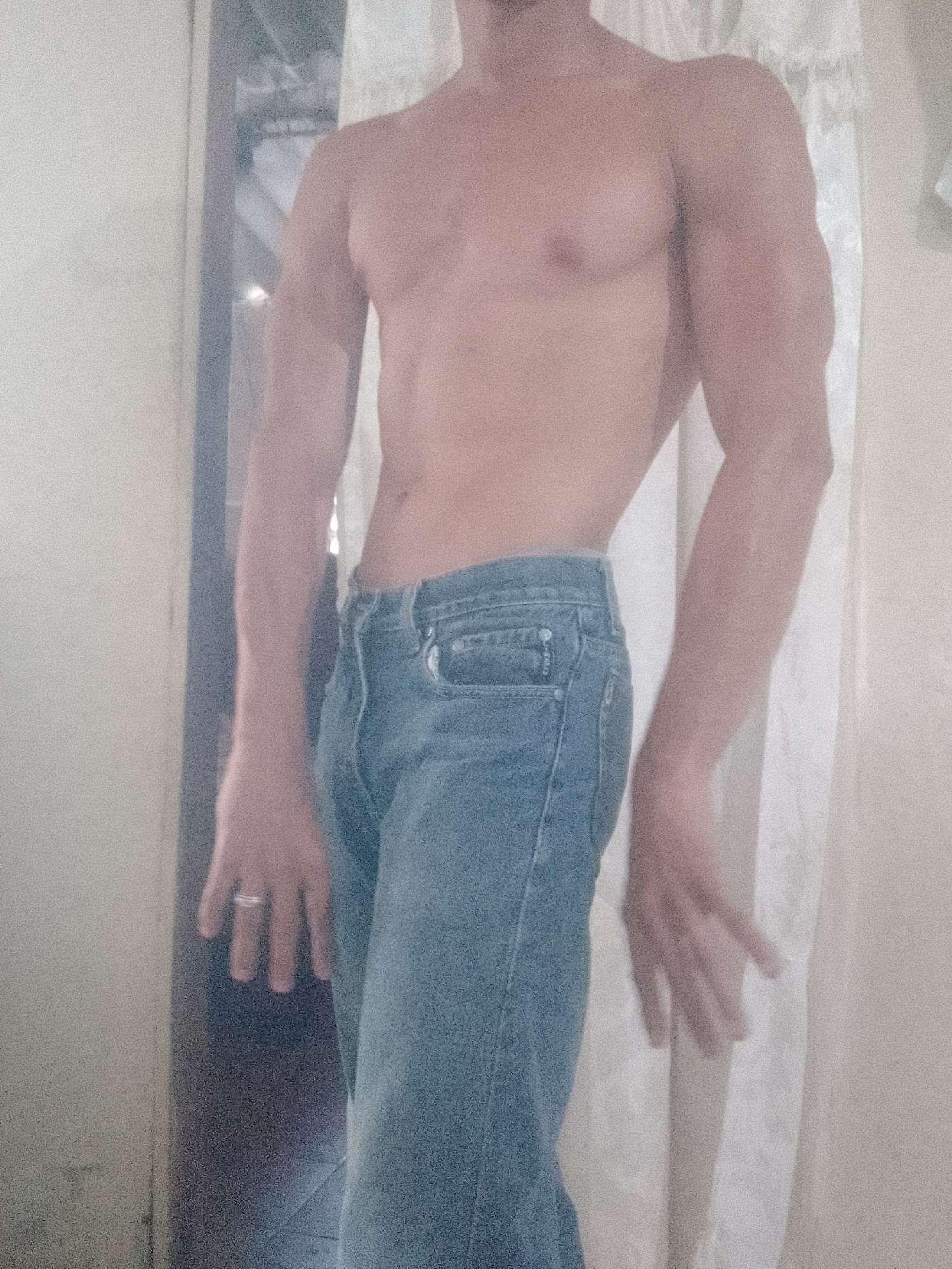 A shirtless man wearing blue jeans stands in a room. He is in front of a doorway on the left and a light-colored curtain on the right. He is wearing a ring on his left hand. The location is unknown an…read more
