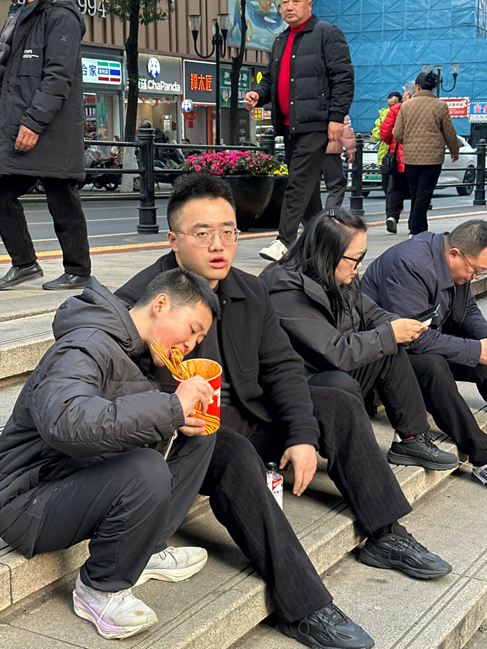 The image portrays an urban street scene in Yuzhong District, China, observed during daylight. In the foreground, four individuals are seated on concrete steps. On the left, a young male in a black pu…read more