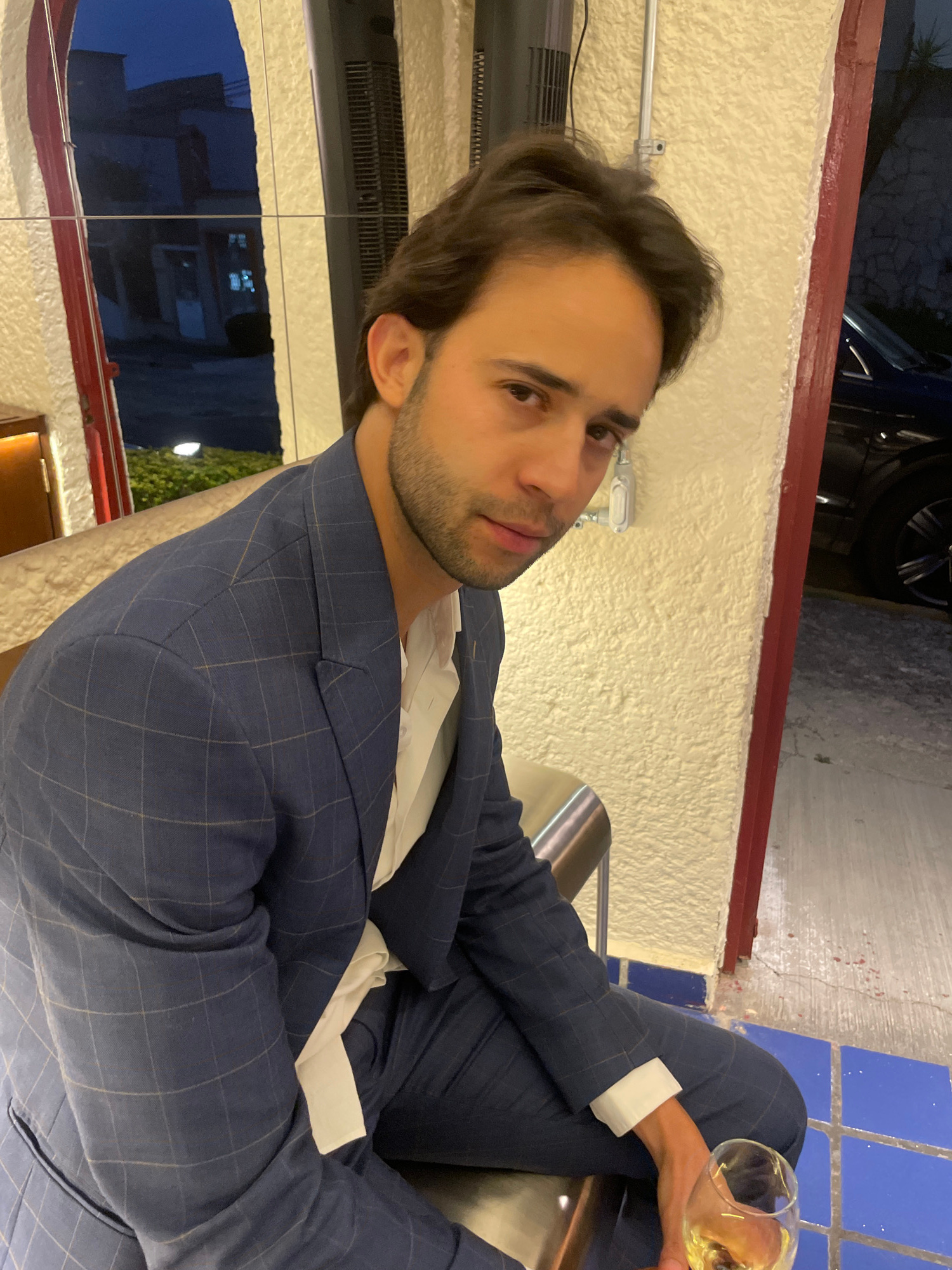 The image shows a man in a blue patterned suit, white shirt and white cuffs, seated and holding a glass of clear beverage, likely wine. He is looking at the camera. Behind him, there is an interior wa…read more