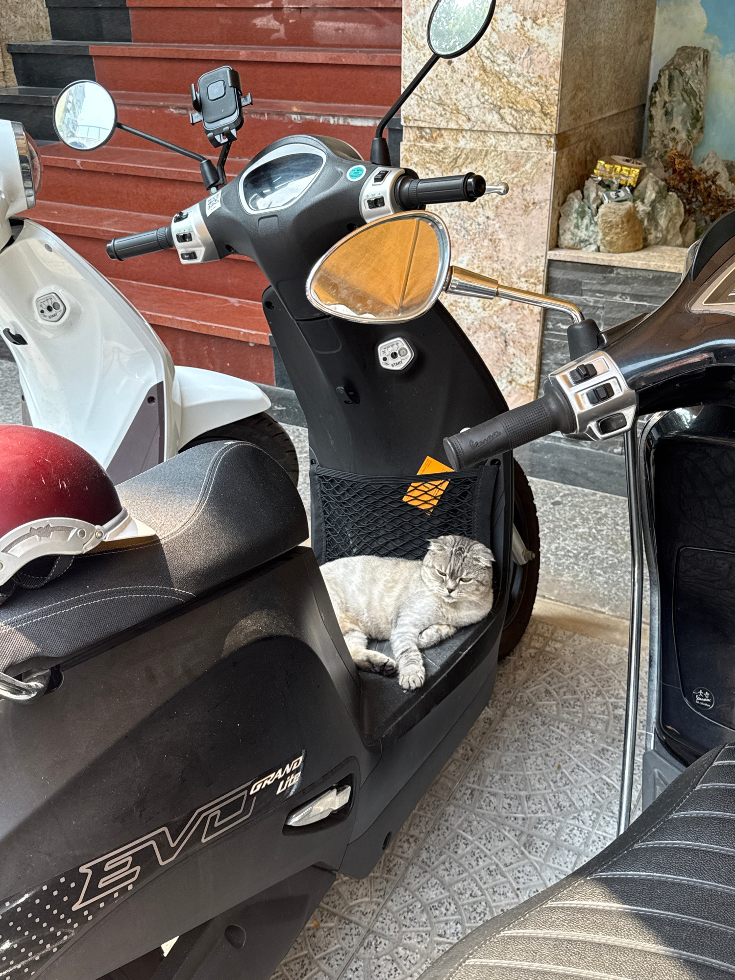 A gray tabby cat is resting in the storage compartment of a black scooter. The scooter is parked on a tiled surface. A white scooter is partially visible beneath the black one, and a red helmet is pla…read more