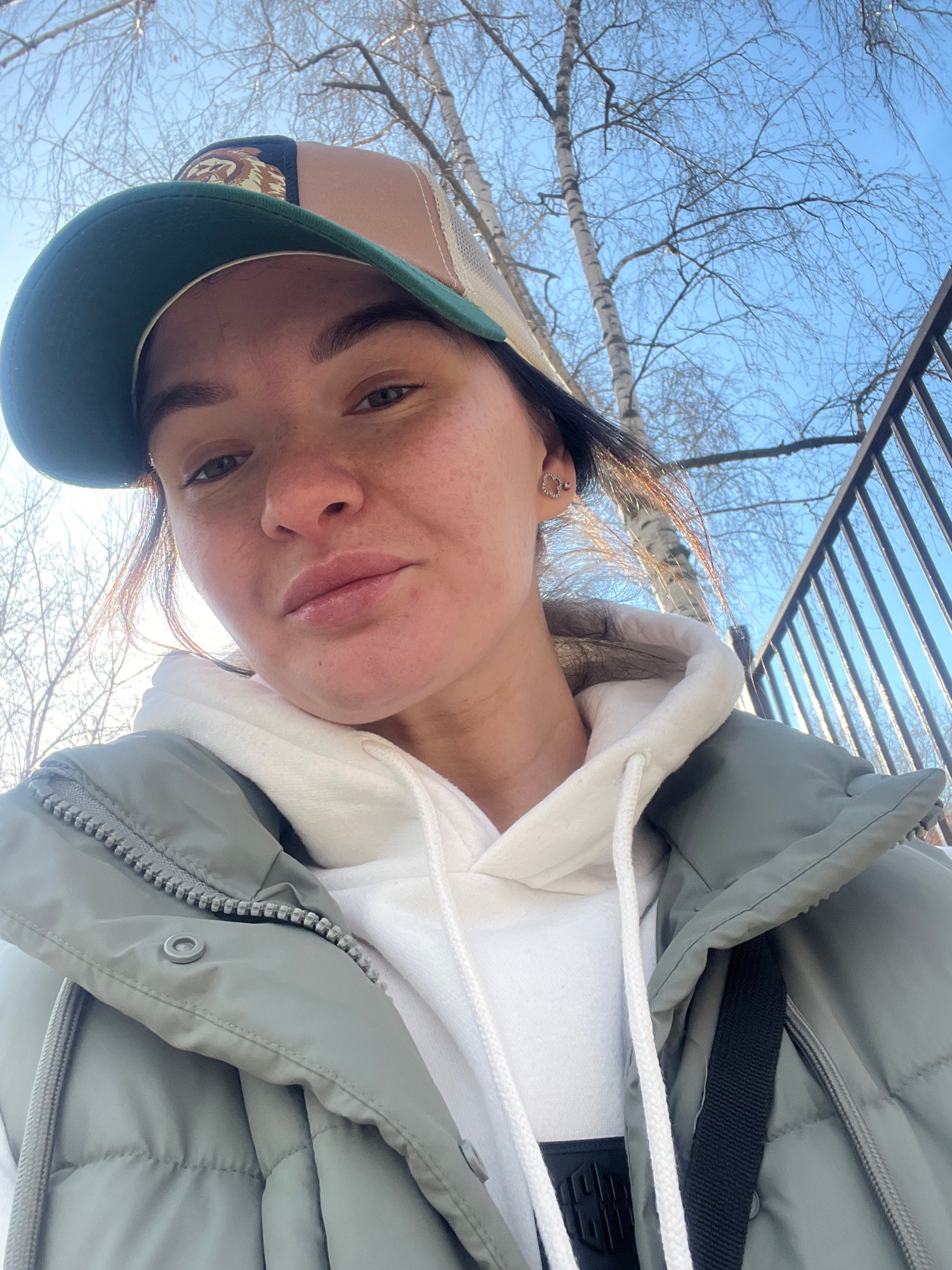A woman wearing a green and tan baseball cap, a white hoodie, and a light gray puffer jacket is positioned in the lower-left quadrant of the frame. She is looking directly at the camera with a neutral expression. Visible freckles are scattered across her nose and cheeks. Bare tree branches and a segment of black metal fencing are visible in the background, against a pale blue sky. The location cannot be definitively determined as Kazan, Russia, from the provided image. | Open Wire