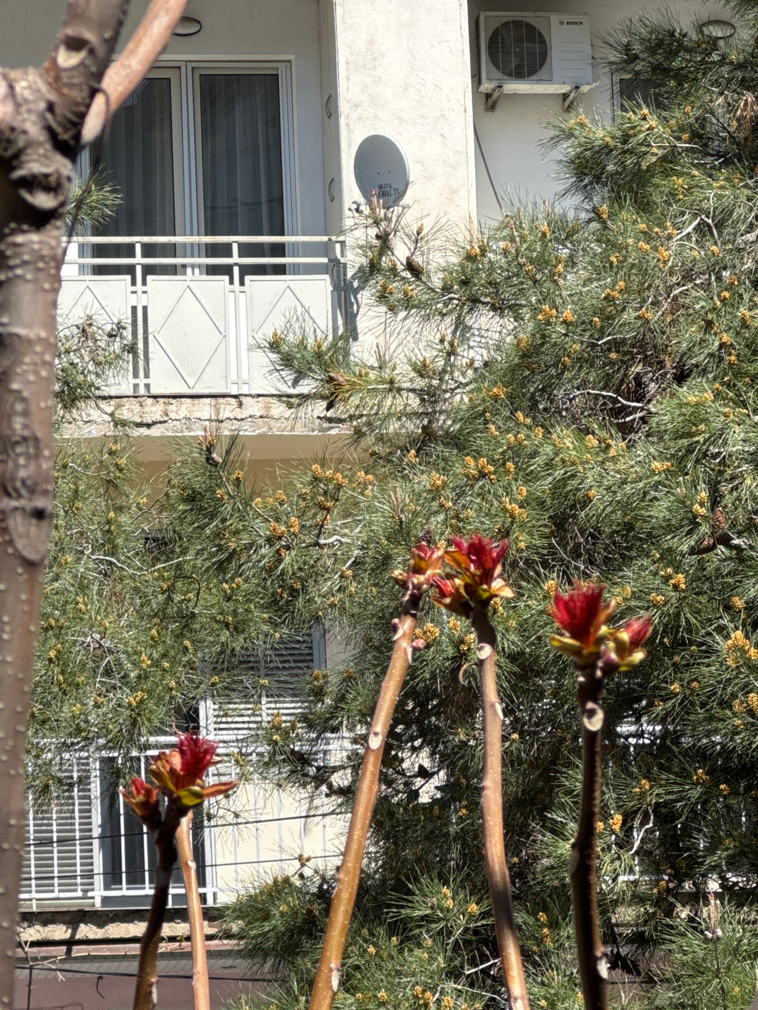 A tree branch with red buds obscures a view of an urban scene, likely in Tbilisi, Georgia. Behind the branch, a multi-story building with white facade and windows featuring a geometric pattern is visi…read more