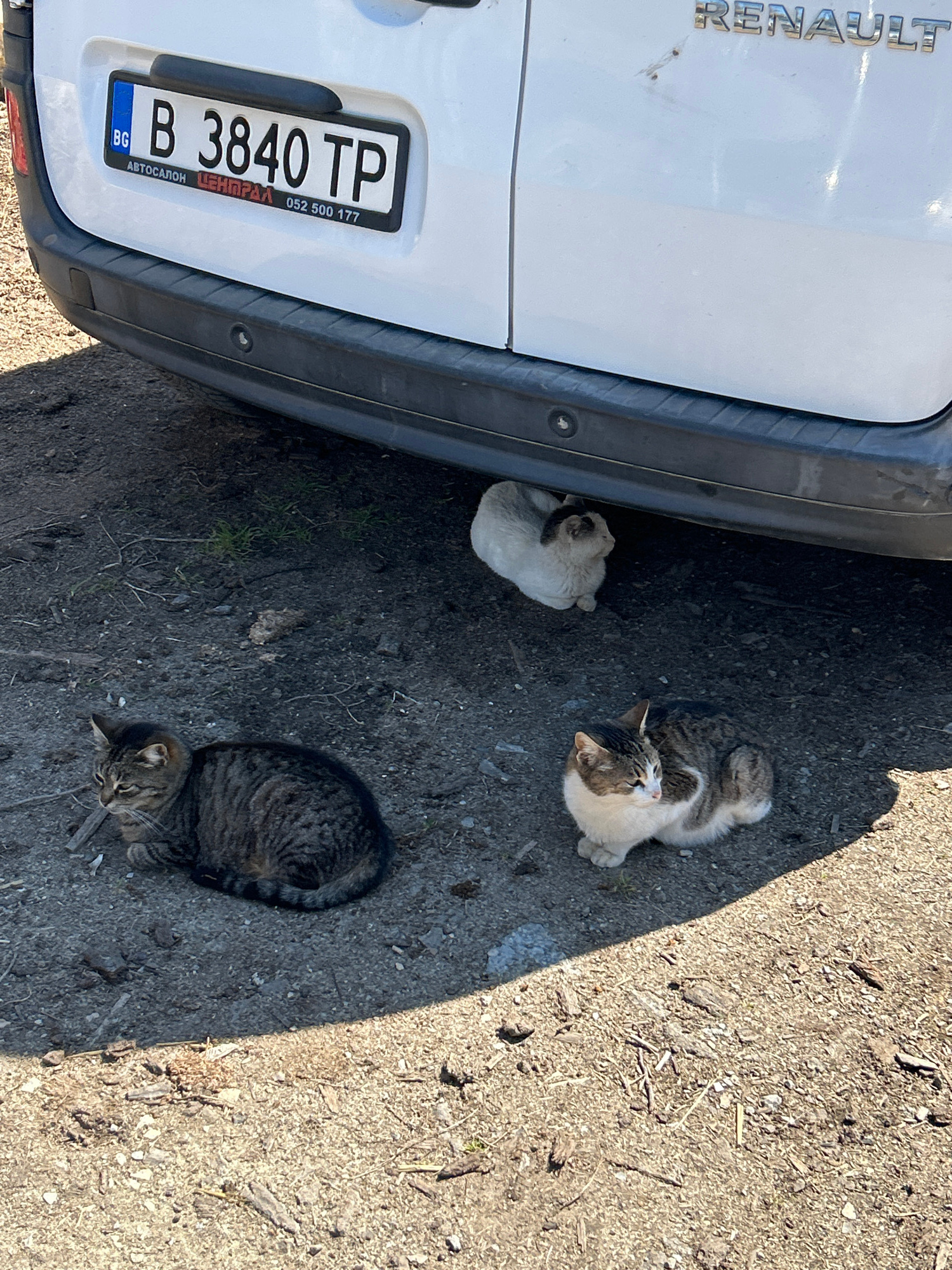 A high-angle shot shows three cats resting on the ground near the rear of a white Renault vehicle. The vehicle's license plate, "B 3840 TP," indicates that the vehicle is registered in Bulgaria. The g…read more