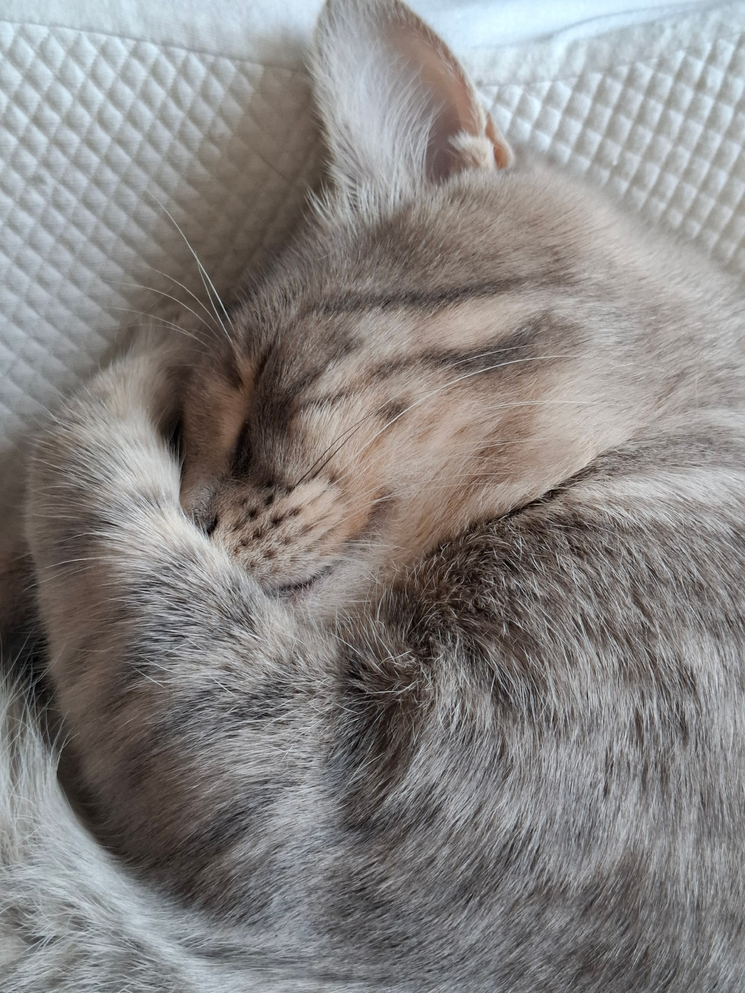 A domestic feline, likely a cat, is depicted in a close-up, top-down view. The animal is curled on its left side, appearing to be asleep, with its eyes closed. Its left front paw is positioned over it…read more