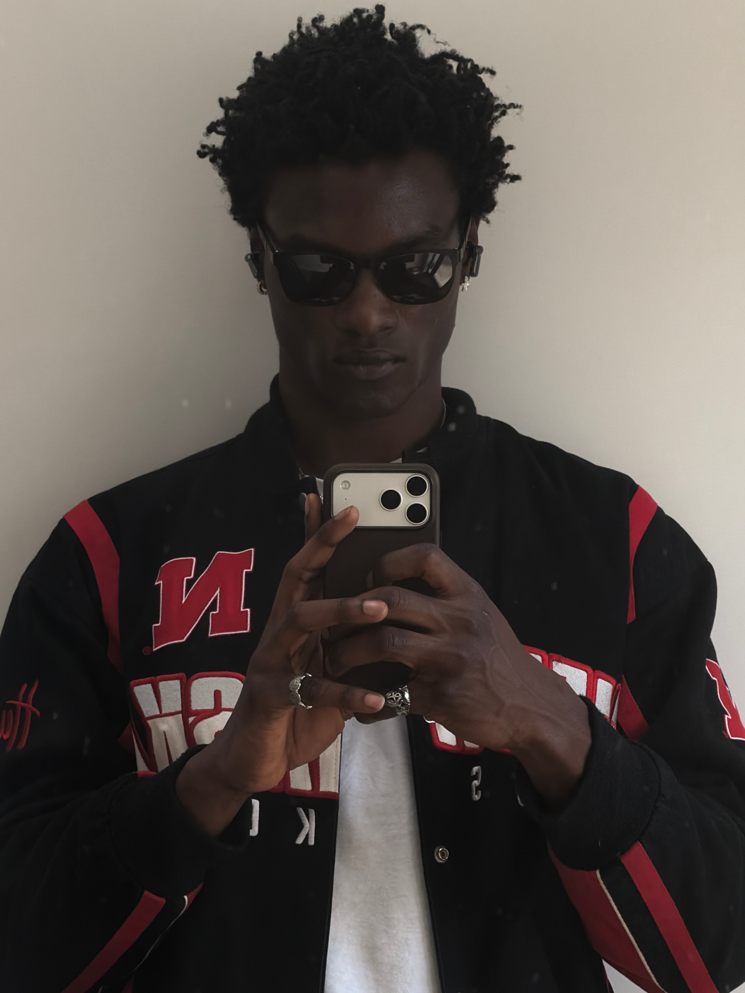 A dark-skinned person wearing sunglasses takes a selfie with a smartphone. They are wearing a black jacket with red and white detailing. They are also wearing rings on their fingers. The background is…read more
