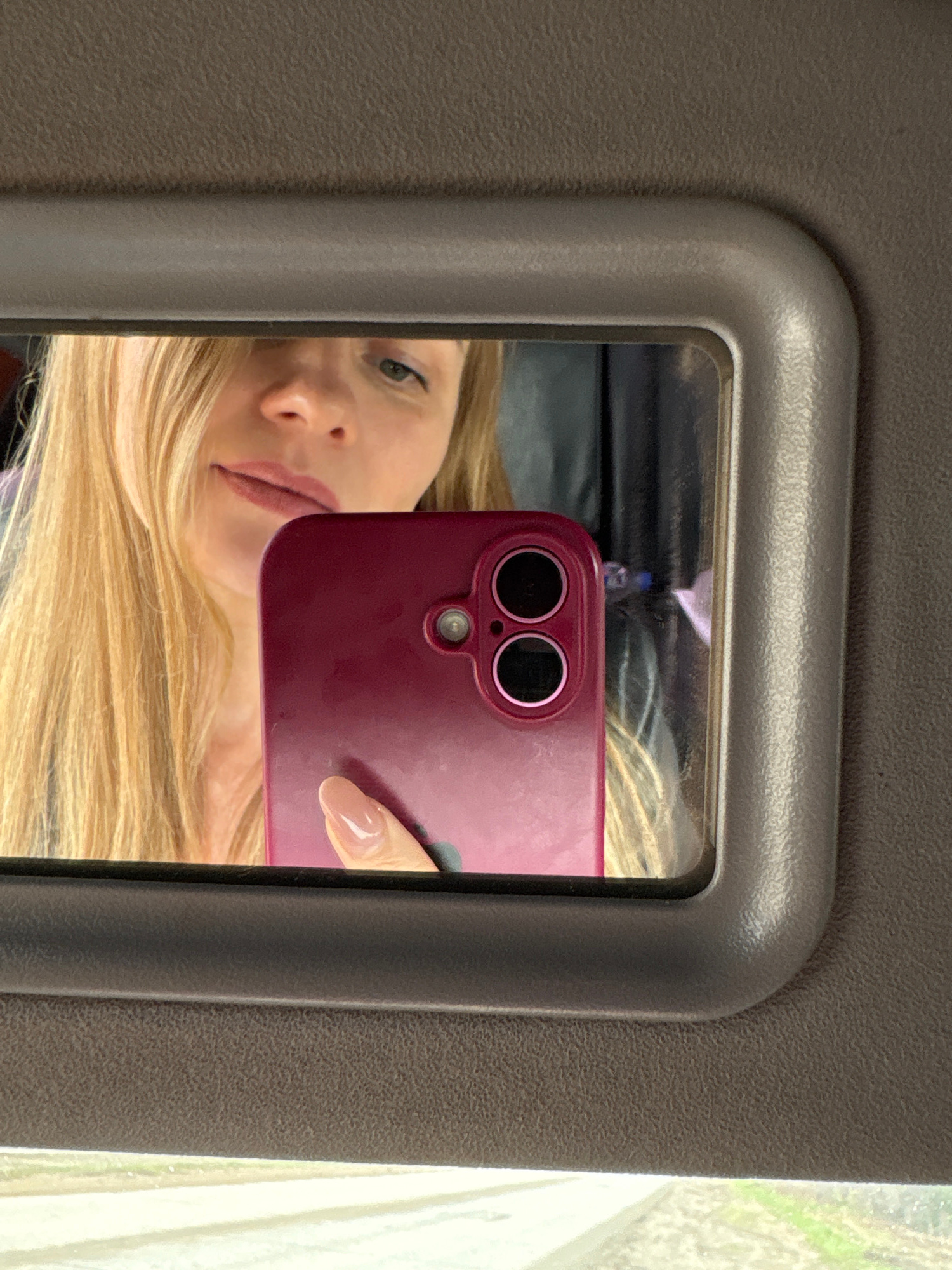 A close-up image shows a person taking a mirror selfie from inside what appears to be a vehicle. The central subject is a grey/silver framed mirror, reflecting the upper body of a person. The person h…read more